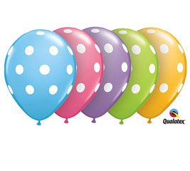 Polka dots never looked so good! Combine great balloons with great colors and polka dots and this is what you get! This assortment of helium quality balloons includes Pale Blue, Goldenrod, Rose, Spring Lilac and Lime Green.