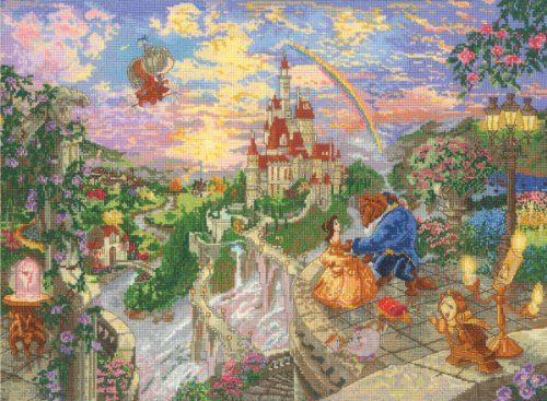Beauty and the Beast Falling in Love. Introduced as the 6th of six in the Disney Dreams Collection by Thomas Kinkade, a joint venture between Mr. Kinkade and the Walt Disney Company. Each original painting is Mr. Kinkade's interpretation of the most cherished and recognizable Disney Characters. Our finished size 12 by 16-inch counted cross stitch kit is stitched on 18-count Aida cloth using a combination of decorative threads and stitches for truly masterful results. Pre-sorted Floss colors are on "Easy to Use" numbered cards.